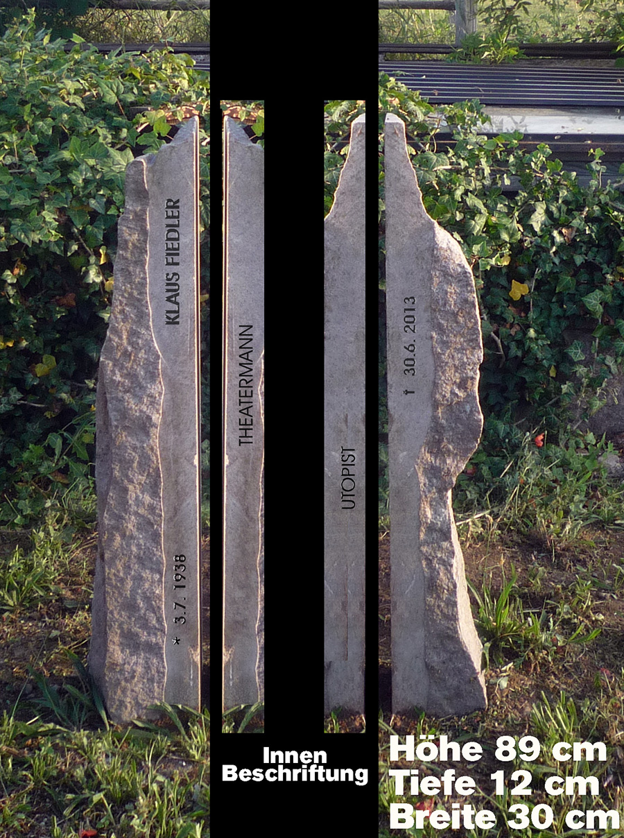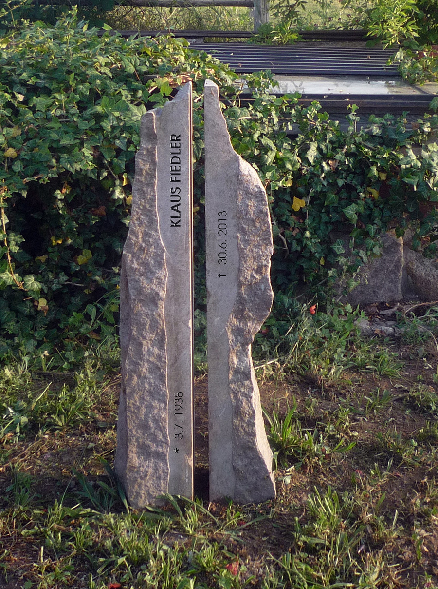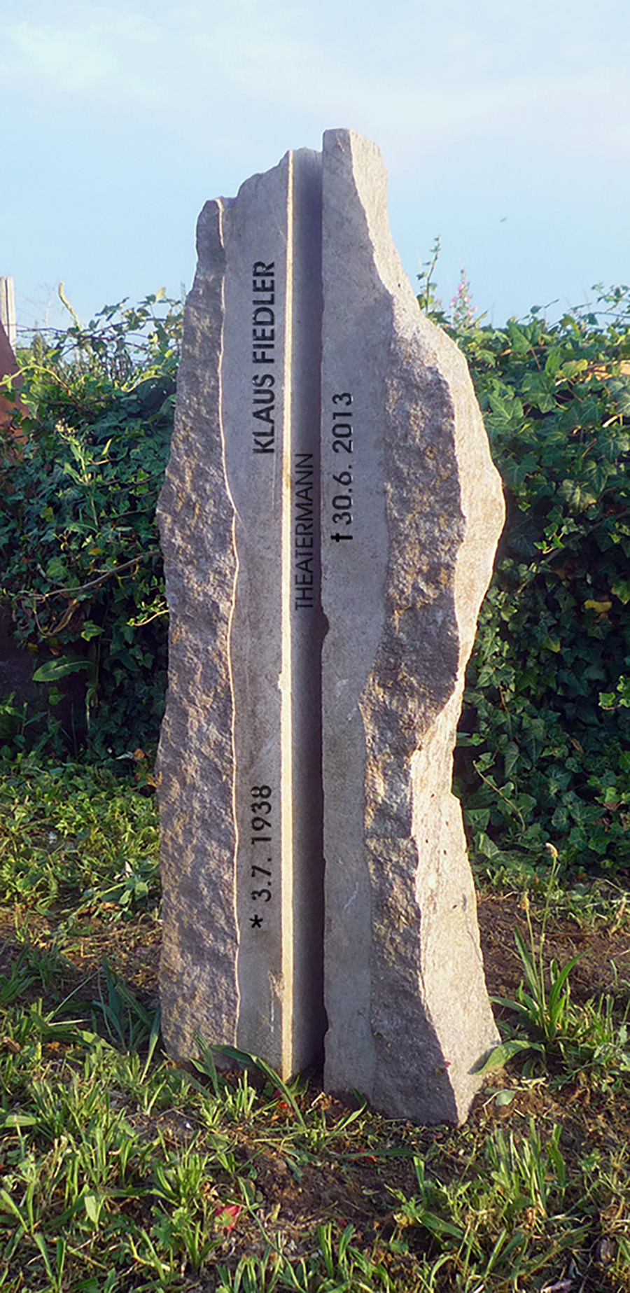 Gestaltung des Grabsteins für den Regisseur, Theatermann und Freund aus bearbeitetem Naturstein mit Inschrift für Klaus Fiedler.